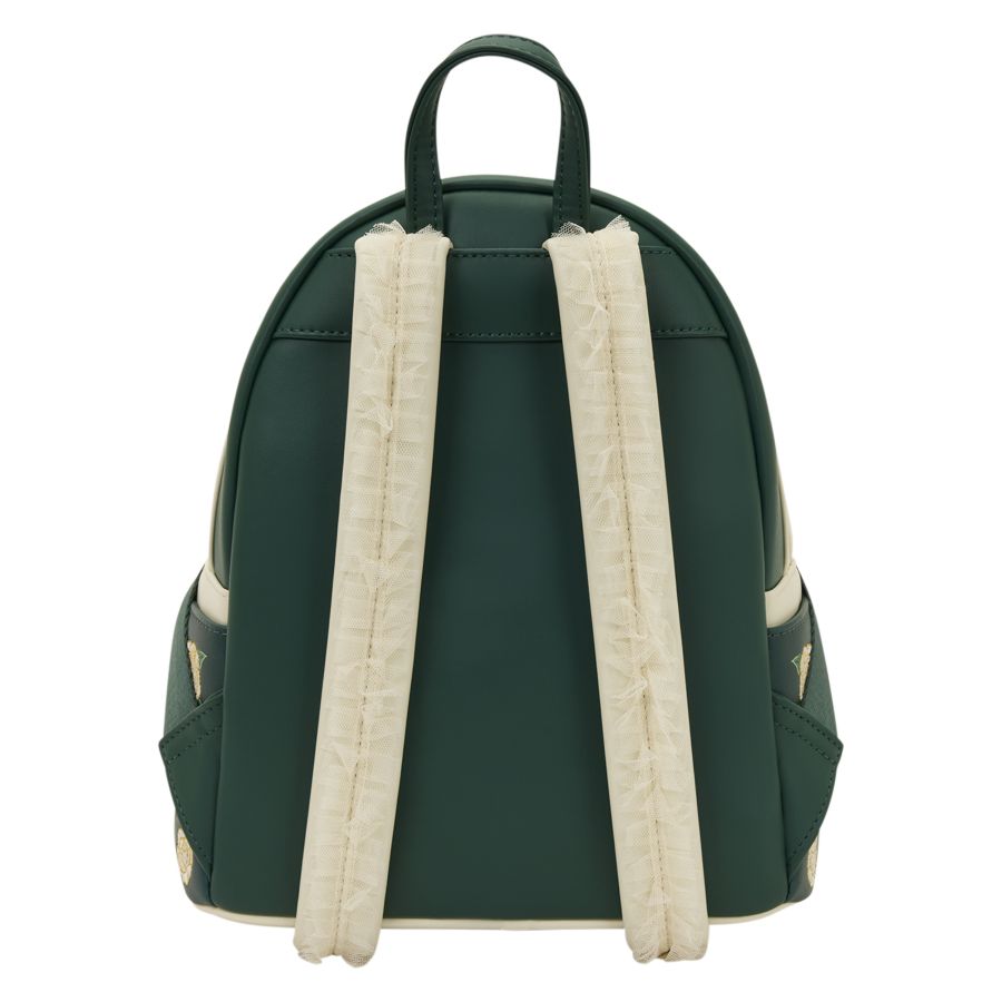 Our new Bridgerton mini backpack features gorgeous florals, gold foil, and debossed and embroidered details. You'll find floral designs all over the front and sides. In the center, you'll find a silhouette in an ornate gold frame. Tulle gives an elegant feel to the straps. Dress to impress this season with this bag!