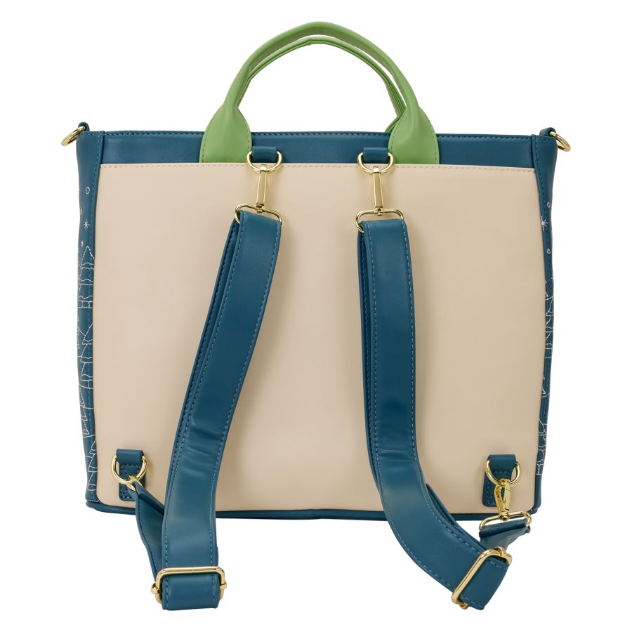 This convertible tote bag can switch between a tote and a backpack. It features an image of Mickey Mouse and Minnie Mouse sledding on a hill with Pluto. You'll also find a padded, debossed pattern that features stockings over the fire, a Mickey-shaped ornament, a Minnie-shaped present, wreaths, and more! Quilting on the sides shows evergreen trees!
