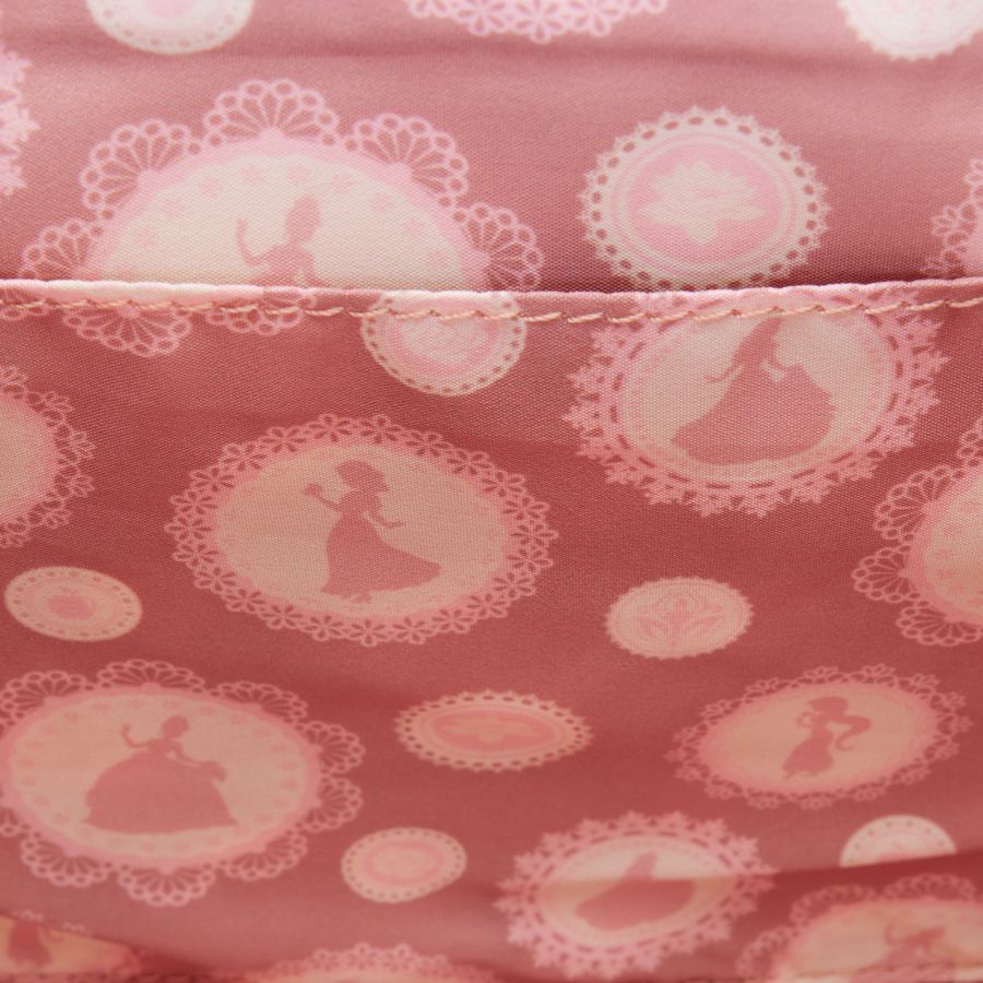 This crossbody bag features a silhouette of Belle holding a rose. She's surrounded by 3D flowers. You'll find lace-like details along the front flap of the bag. There's also a satin bow attached to the top handle! Inside, there's a super cute interior lining featuring various silhouettes of Disney Princesses.