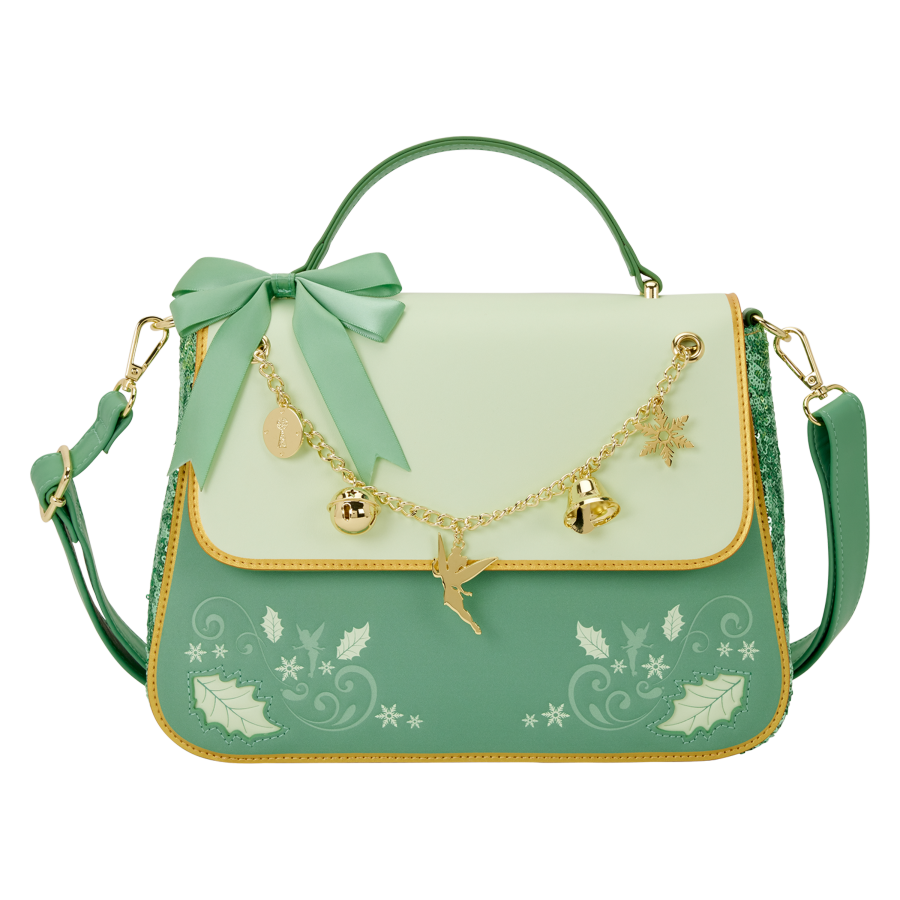 This crossbody bag is inspired by Tinker Bell from Disney’s Peter Pan! You'll find sequin details on the sides of the bag. The front features embossed designs, leaves, a satin bow, and metal charms of a keyhole, bell, Tinker Bell, a thimble, and a star! It's an elegant and festive accessory that'll go with any outfit you put together this season! This bag comes with a carry handle and adjustable shoulder strap so you can wear it as a handbag or crossbody.