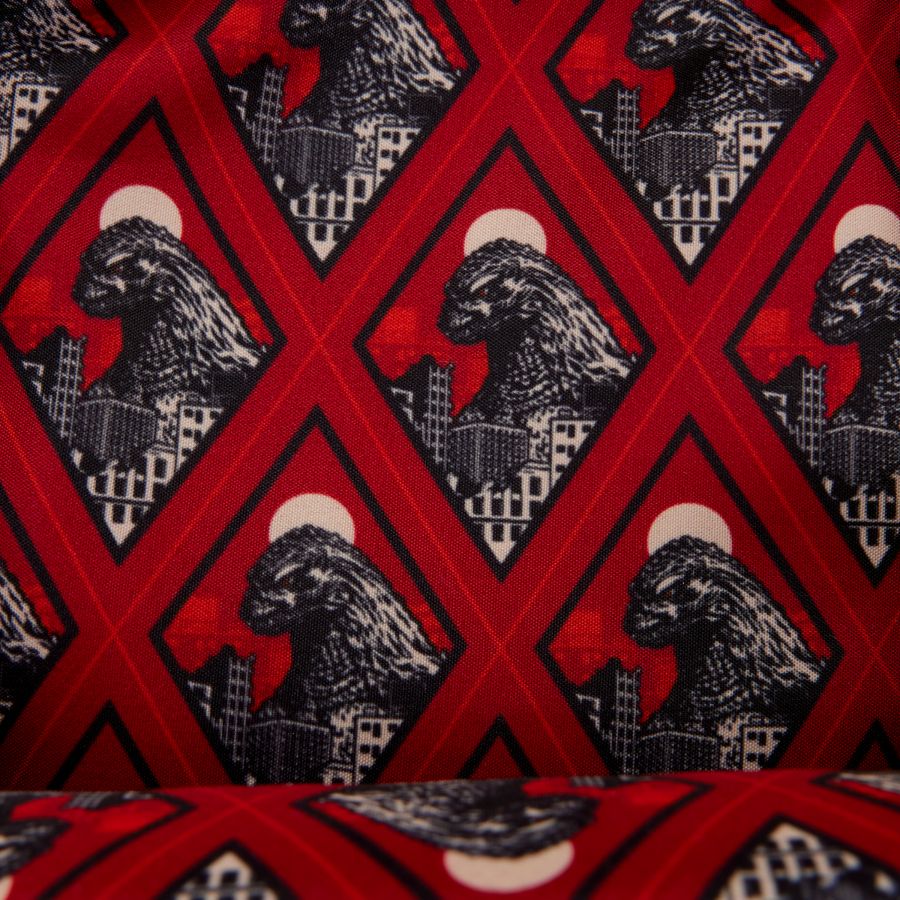 The front pocket features an image of Godzilla towering over a cityscape. A red sky is behind him. The rest of the bag is black and features scale-like designs over it. Attached to the crossbody strap is a detachable coin bag featuring an image of Godzilla's footprint. It's a fun piece that makes a statement and shows off one of your favorite monsters!