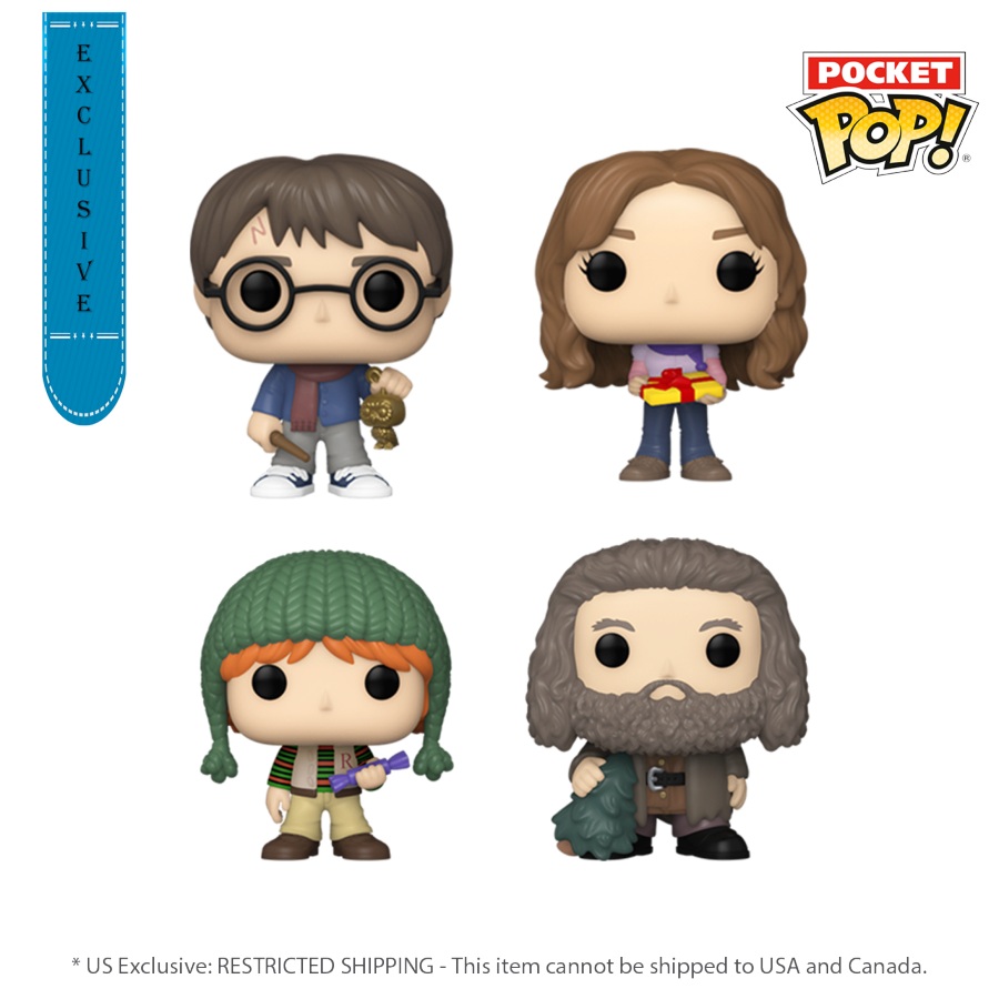 This 4-pack features Pocket Pop! Harry Potter, Pop! Hermione Granger, Pop! Ron Weasley, and Pop! Rubeus Hagrid.
