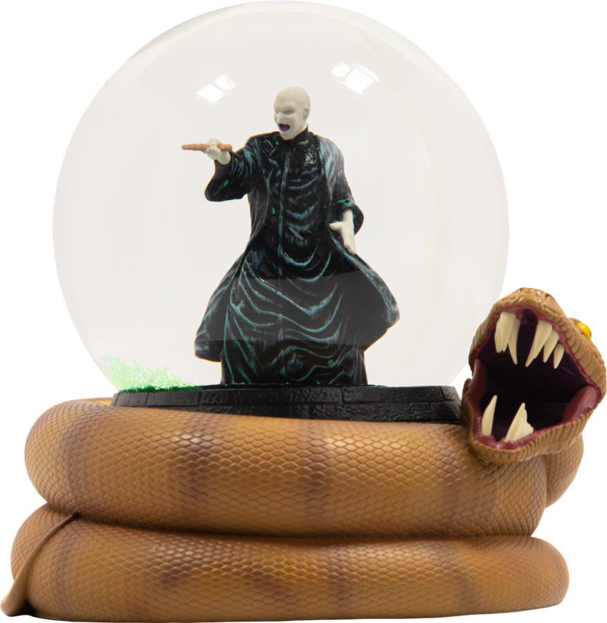 The base of the snow globe is a testament to Voldemort's relentless pursuit of immortality, featuring a sculpted representation of Nagini, his final and most elusive horcrux. Coiled around the base, Nagini adds a sinister touch, emphasizing the dark alliance between the Dark Lord and his faithful serpent companion.