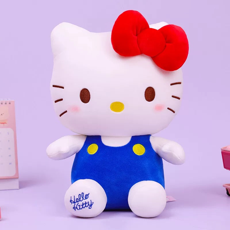 Adorable 15 inch Hello Kitty Plush Toy dressed in her blue overalls and iconic red bow.