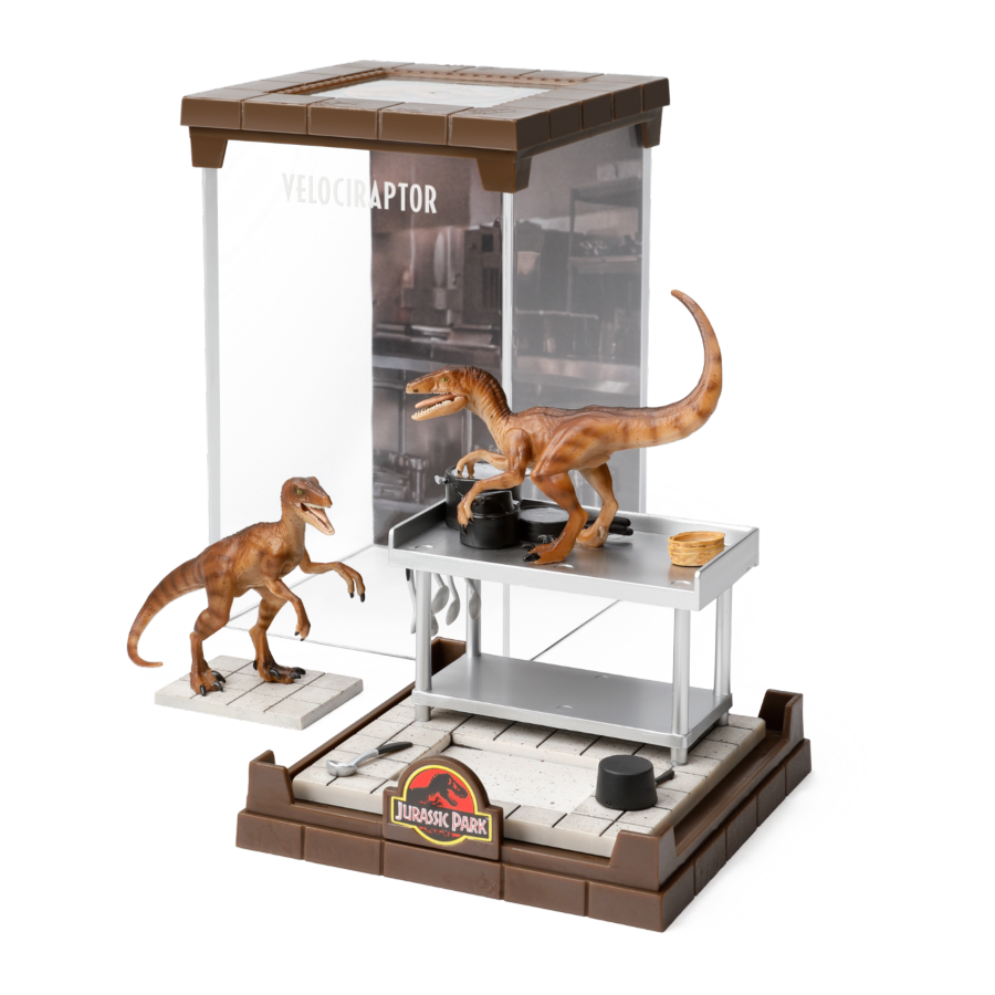 The Velociraptors from the Jurassic Park franchise are brought to life in this finely sculpted diorama featuring two dinosaurs.