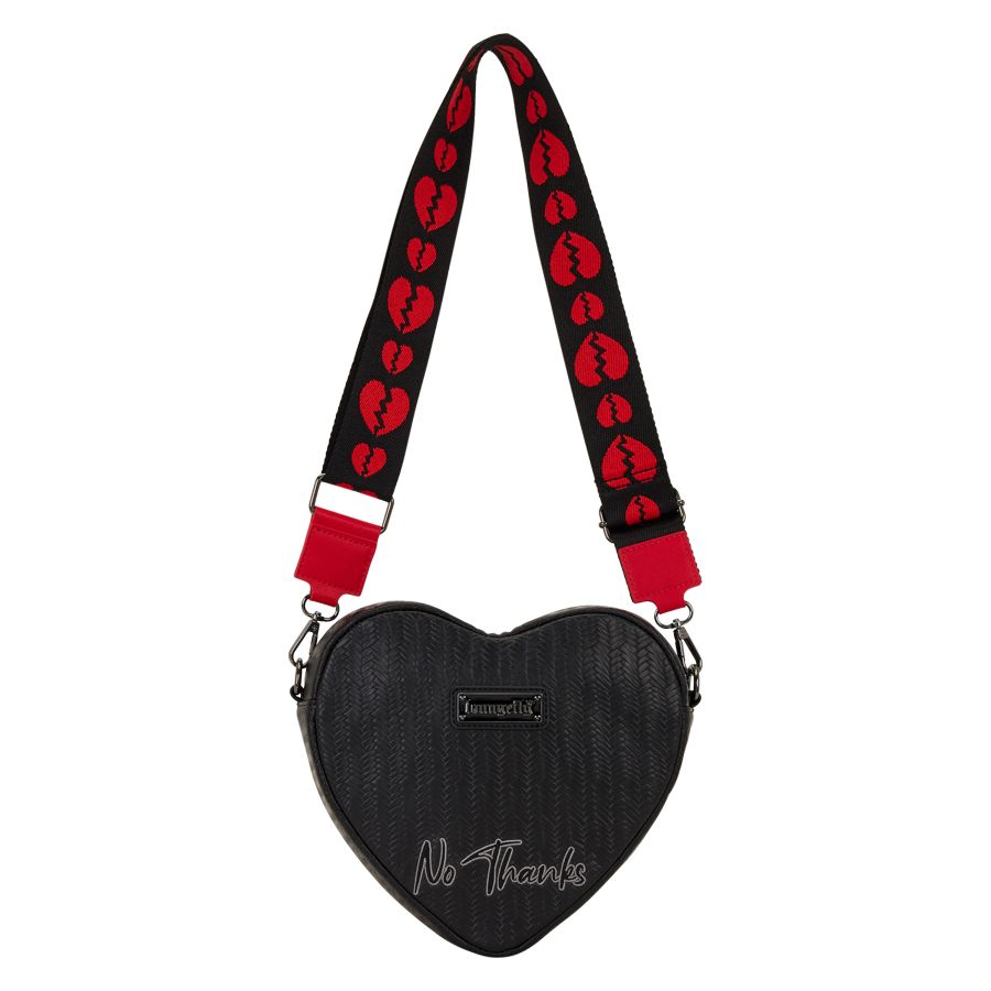 This figural crossbody is in the shape of a heart. The body features a black faux basket weave and embroidered on the back, it says "No Thanks." The front pocket is also in the shape of a heart but this one is broken. You'll find velvet details on it.