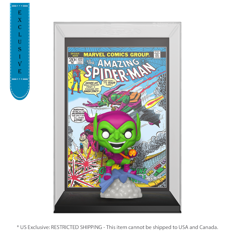 The Pop! Green Goblin is here to shock your collection as this exclusive Pop! Comic Cover, featuring this villainous fiend as he flies in front of the cover of The Amazing Spider-Man #122 on his glider.