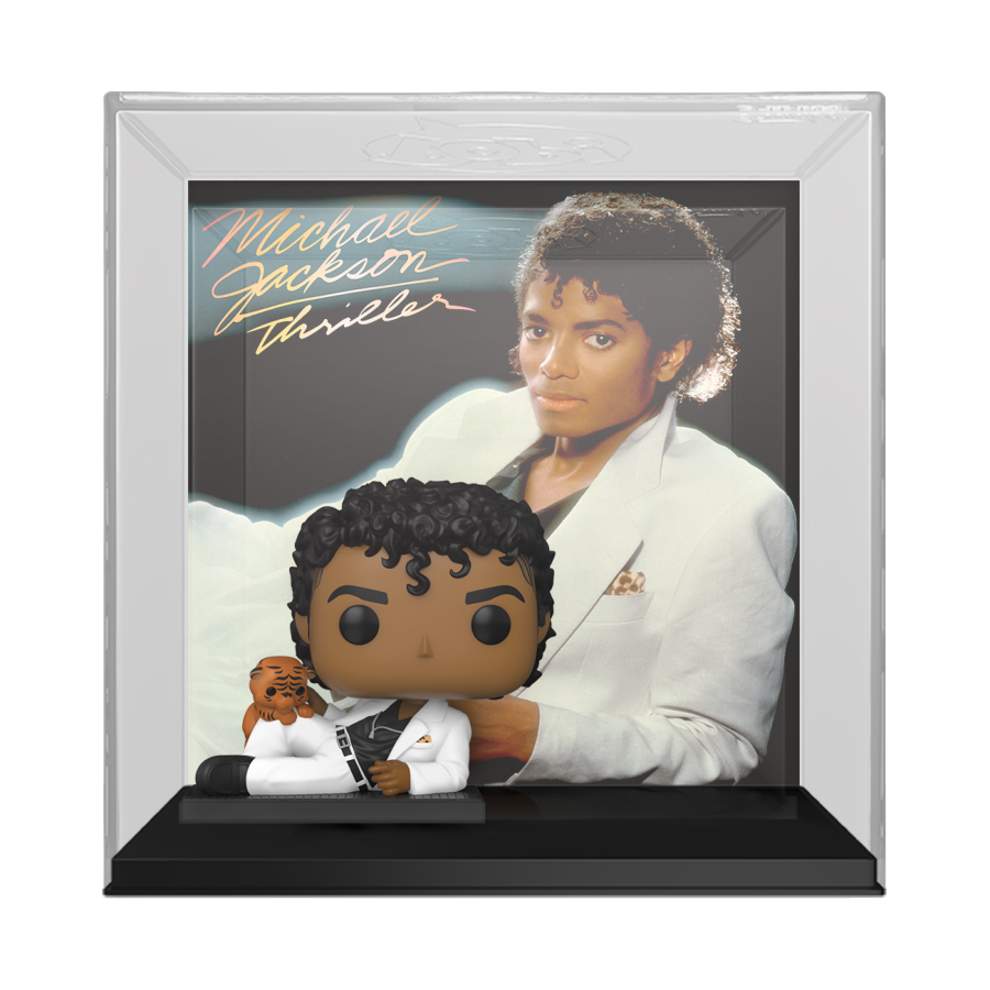 Rock your Michael Jackson set with this Pop! Albums Cover of his Thriller album, featuring Pop! Michael Jackson with Pop! Tiger Cub from the iconic Thriller photoshoot!