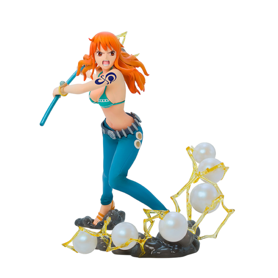 Proud navigator of the Thousand Sunny, Nami is better known for her love of treasure and her unwavering commitment to helping Luffy become the King of the Pirates than for her strength. This figurine by ABYstyle Studio captures the moments when she prepares to use her Climat-Tact to defend the Straw Hat Crew. Her floating hair and dynamic posture are even more emphasized by the base, which features flashes of light and wind, illustrating the power of her weapon. A must-have for One Piece fans, showcasing Nami's strength and confidence in battle when her friends are threatened.