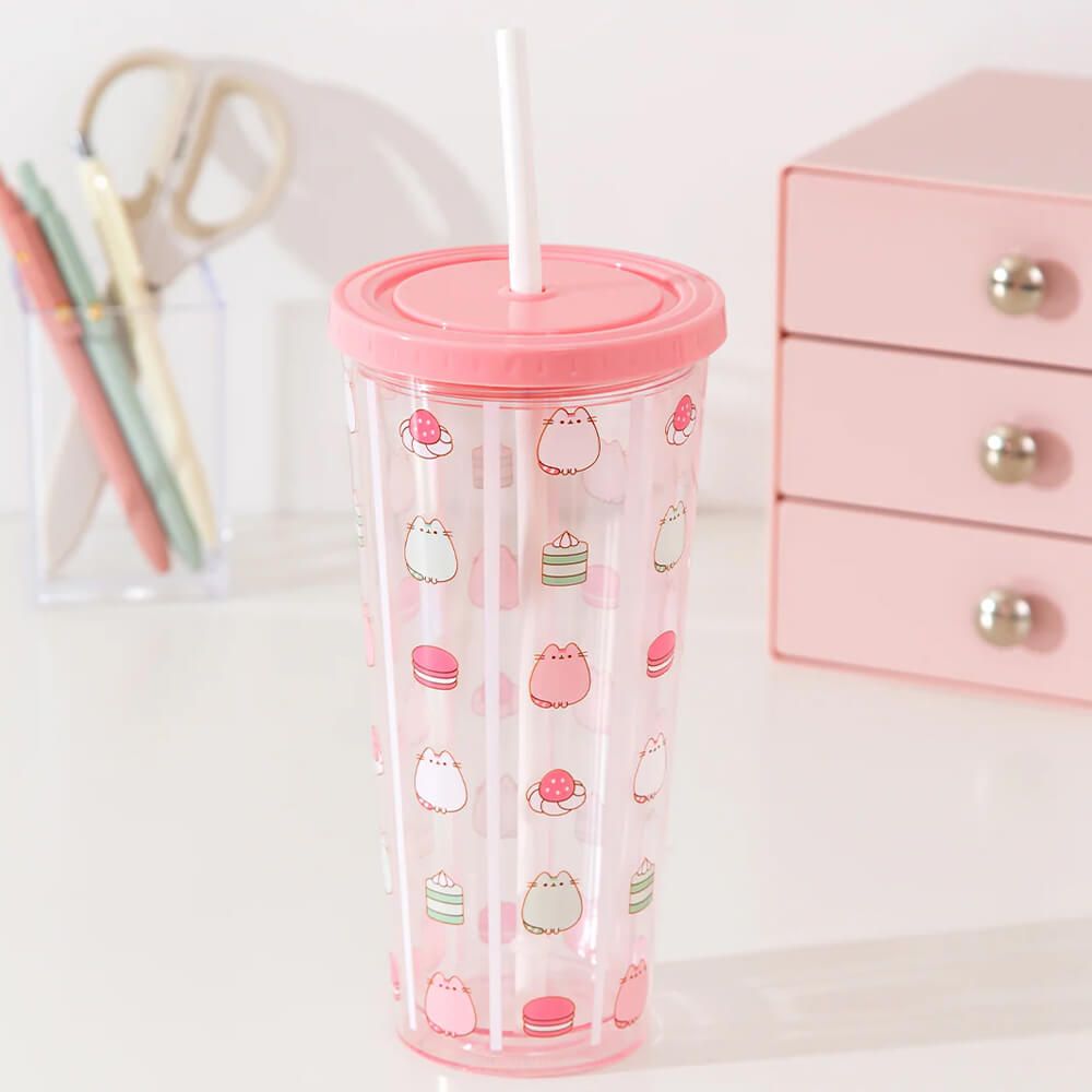 Sip your favourite beverages in style with this Pusheen beaker and straw set. Elevate your refreshments, with a cute design featuring Pusheen alongside a selection of cakes and sweet treats!