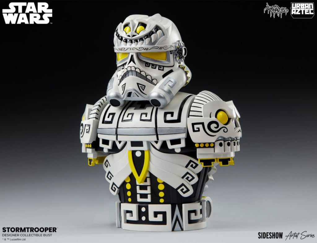 In signature Urban Aztec style, Hernandez implements geometric shapes and glyphs inspired by graffiti and Maya culture alike, adding modern flare to traditional Mesoamerican masks and iconography. Shocks of bright yellow and brilliant silver pop on the classic black and white palette, allowing this trooper to stand out from the legion. Such extreme detailing, historical artistry, and love of the Star Wars legacy make this uniquely styled villain an iconic addition to any fan's collection.