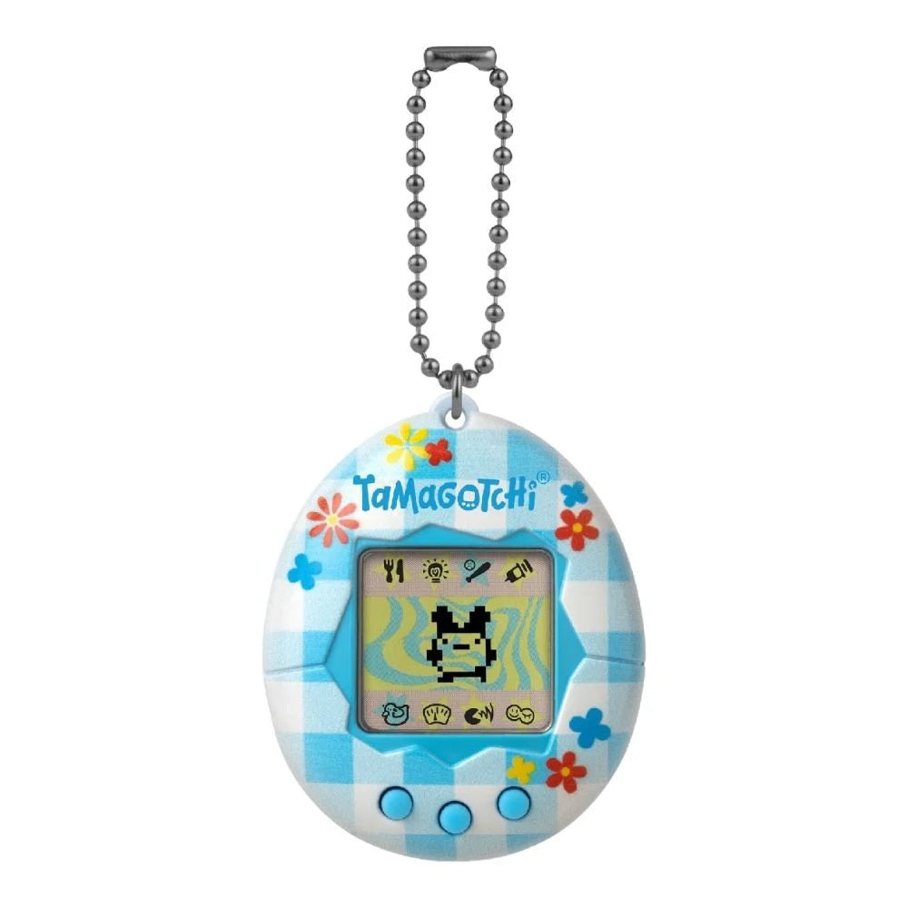 Includes Character game where you have to guess which way the Tamagotchi will move next! Colorful Tama blue shell with yellow 'Tamagotchi' and buttons, and original programming and characters, and updated logo.